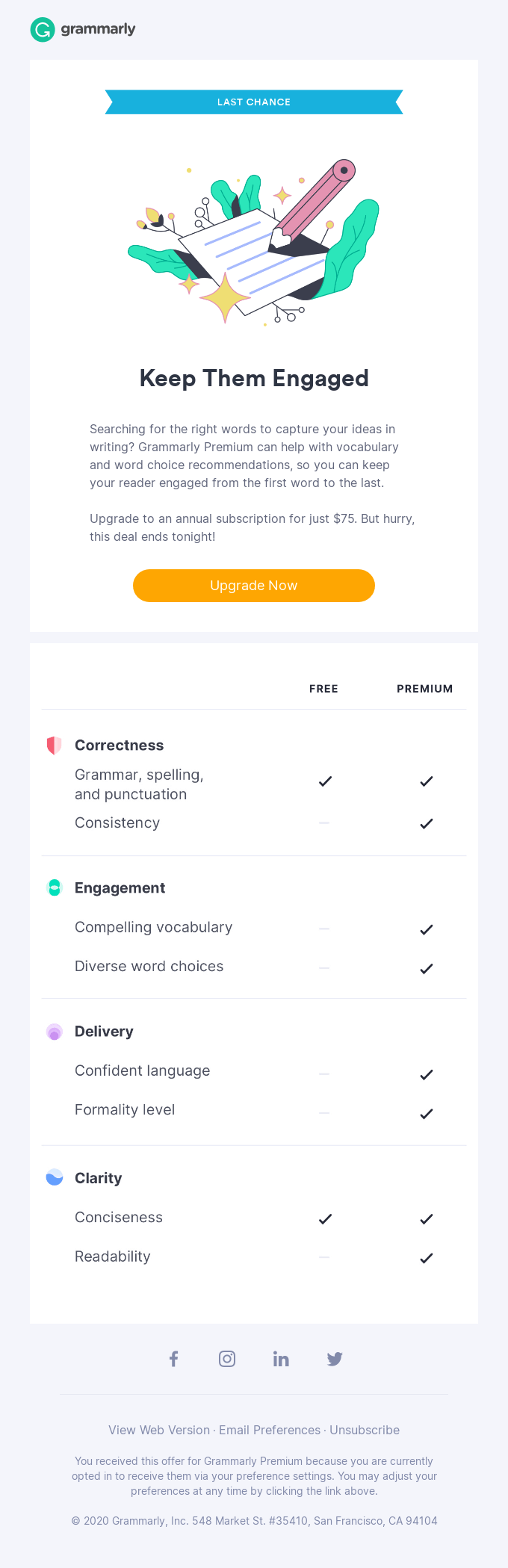 You received this offer for Grammarly Premium because you are currently opted in to receive them via your preference settings. You may adjust your preferences at any time by clicking the link above.