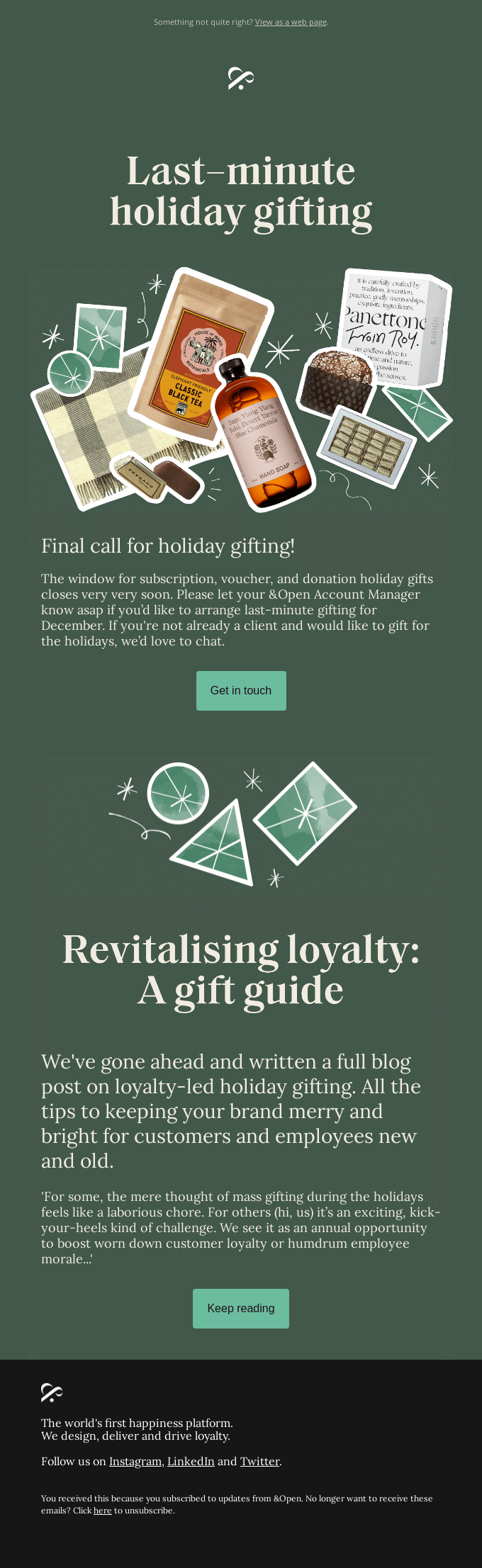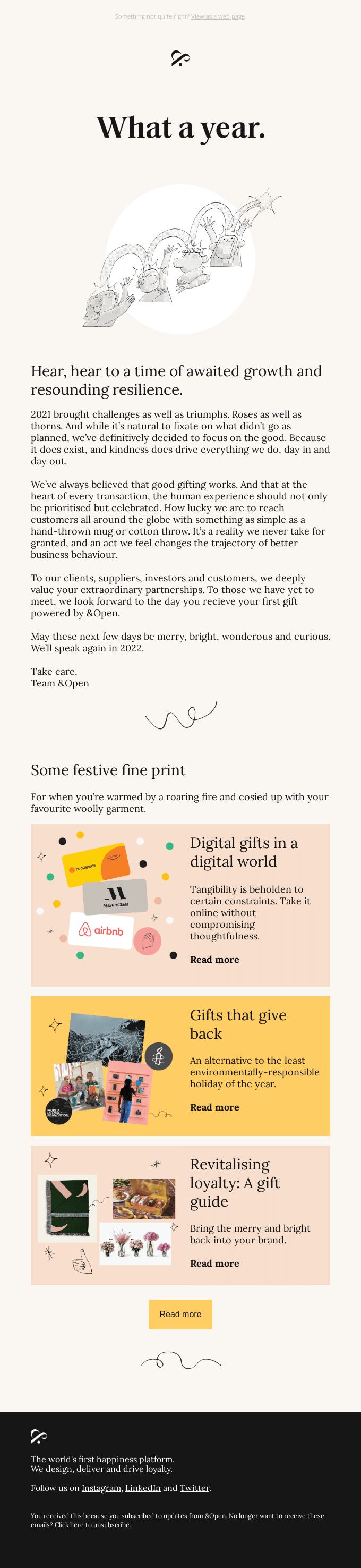 &Open is a happiness platform that brings happy newsletters, news, and occasional gifts. Here you can find &Open's email examples.