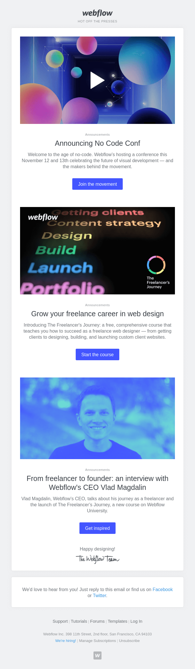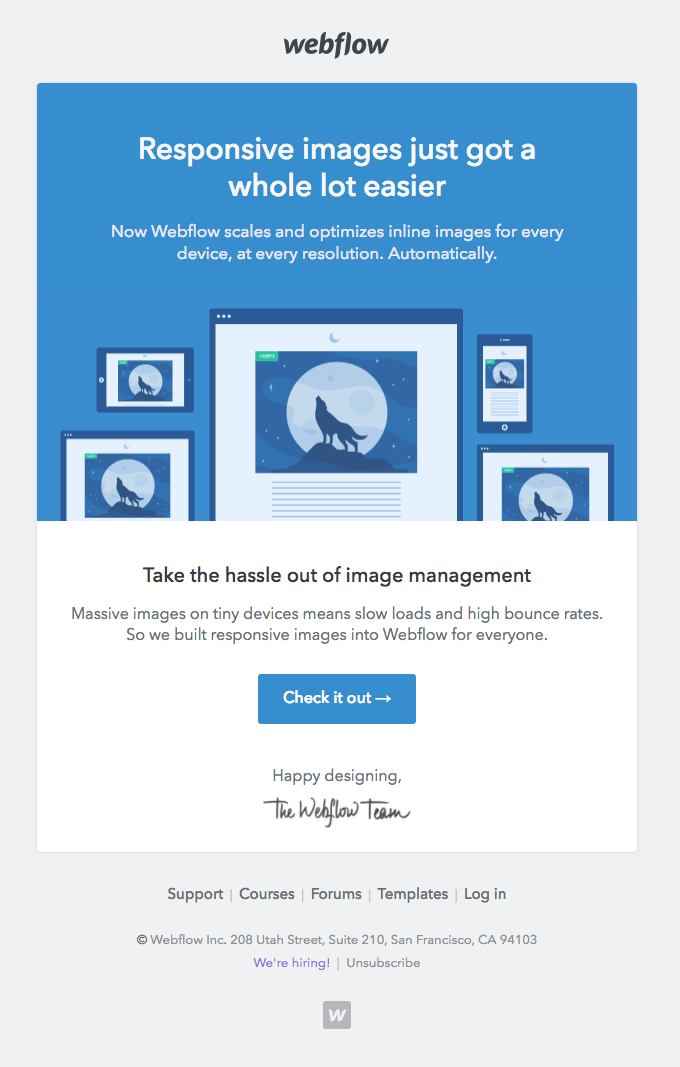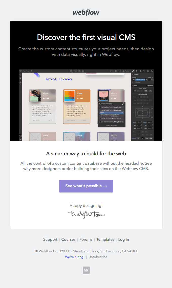 Webflow is a no-code website builder platform that provides many practical solutions to create well-designed websites. Here are a few email examples from Webflow.