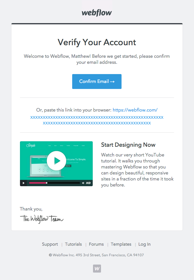 Welcome to Webflow – Please Verify Your Account - Newsletter Text Content Verify Your Account Welcome to Webflow, Matthew! Before we get started, please confirm your email address. Confirm Email → Or, paste this link into your browser:https://webflow.com/api/user/authenticate?xxxxxxxxxxxxxxxxxxxxxxxxxxxxxxxxxxxxxxxxxxxxxxxx Start Designing Now Watch our very short...