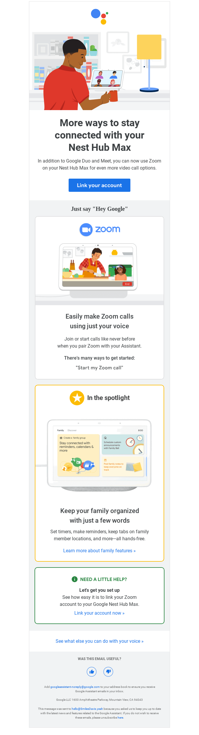 This message was sent to [email protected] because you asked us to keep you up to date with the latest news and features related to the Google Assistant. If you do not wish to receive these emails, please unsubscribe here.