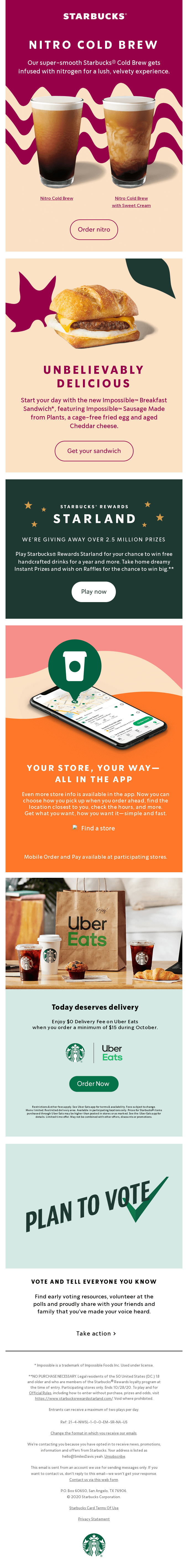 25% off hot coffees will be automatically applied in the Uber Eats app. Hot coffees include hot brewed coffee, hot espresso beverages, americanos, cappuccinos, flat whites, lattes, macchiatos and mochas. Valid on orders through 9/30/2020 and orders placed until 11 a.m. local time each day. Terms, taxes and other fees may apply. Fees subject to change. Menu limited. Restricted delivery area. Available in participating locations only. Prices for Starbucks® items purchased through Uber Eats may be higher than posted in stores or as marked. See the Uber Eats app for details. Limited time offer. May not be combined with other offers, discounts or promotions. Product image may vary from delivered product.