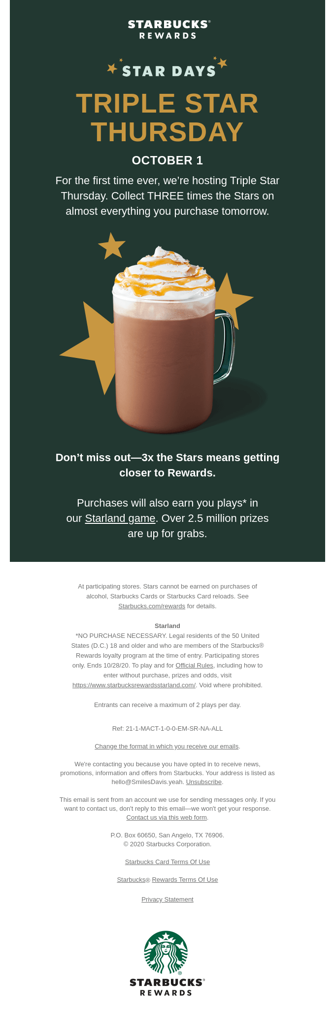 Earn 1 Star per $1 spent when you scan your member barcode in the app, then pay with cash, credit/debit cards or mobile wallets at participating stores. You can also earn 1 Star per $1 spent when you link a payment method and pay directly through the app. Earn 2 Stars per $1 spent when you load funds and pay with your digital Starbucks Card in the app. You can also earn 2 Stars per $1 spent when you pay in-person at a participating store with your registered physical Starbucks Card or scan your member barcode in the app, and then use any physical Starbucks Card (regardless of whether it is registered) to complete the purchase. See starbucks.com/rewards for details.