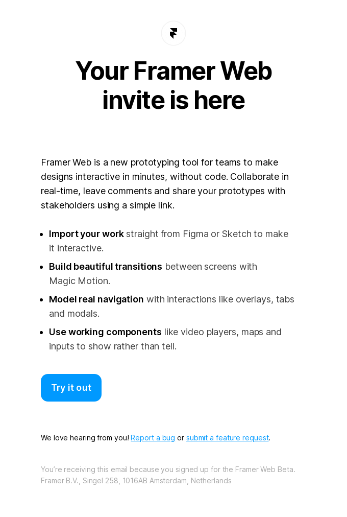 Soon you’ll get a chance to try all the new features we’ve been building for Framer Web. When your invite is ready, we’ll send you an email with a link to get started.