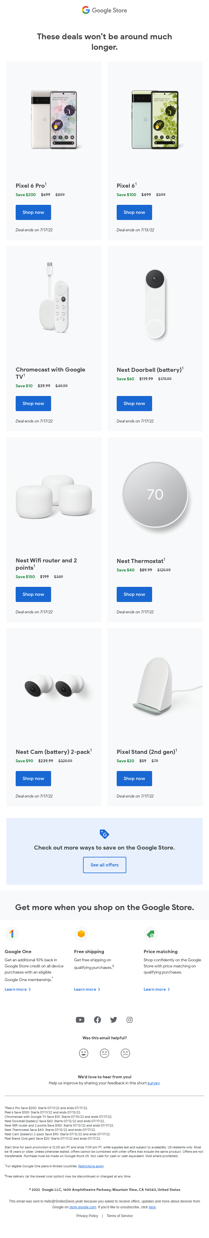Start time for each promotion is 12:00 am PT and ends 11:59 pm PT, while supplies last and subject to availability. US residents only. Must be 18 years or older. Unless otherwise stated, offers cannot be combined with other offers that include the same product. Offers are not transferable. Purchase must be made on Google Store US. Not valid for cash or cash equivalent. Void where prohibited.