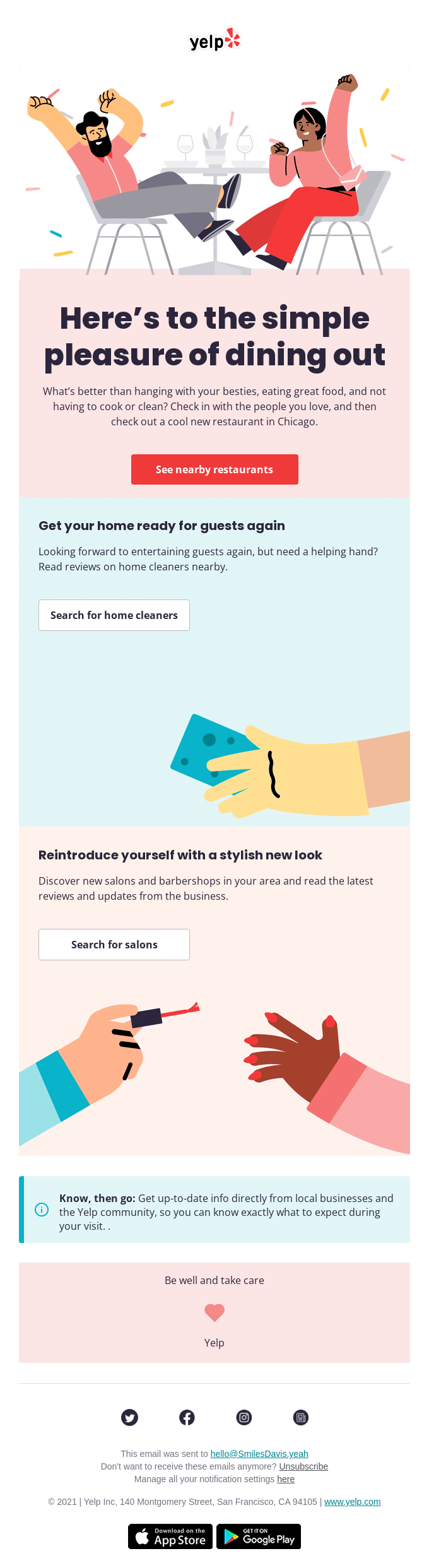 Know, then go: Get up-to-date info on Covid-19 health & safety measures, shared by businesses and the Yelp community. Whether you're staying in or going out, the community's got your back.