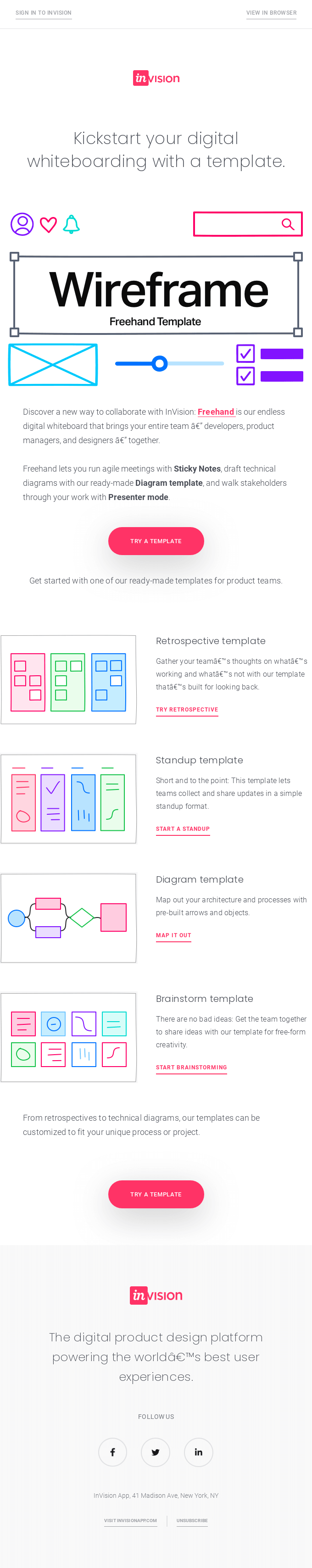 Want to explore how a design will work — before you build? With the Diagram template in InVision Freehand, you can map out your architecture or processes with pre-built arrows and objects.