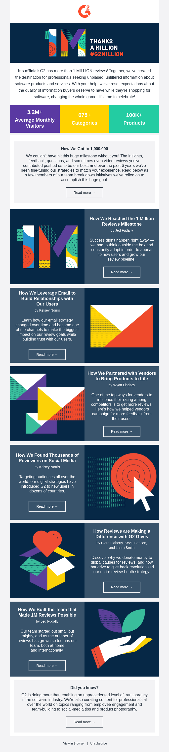 Time to Celebrate: G2 Hits 1,000,000 Reviews! - Newsletter Text Content It's official: G2 has more than 1 MILLION reviews! Together, we've created the destination for professionals seeking unbiased, unfiltered information about software products and services. With your help, we've reset expectations about the quality of information buyers...
