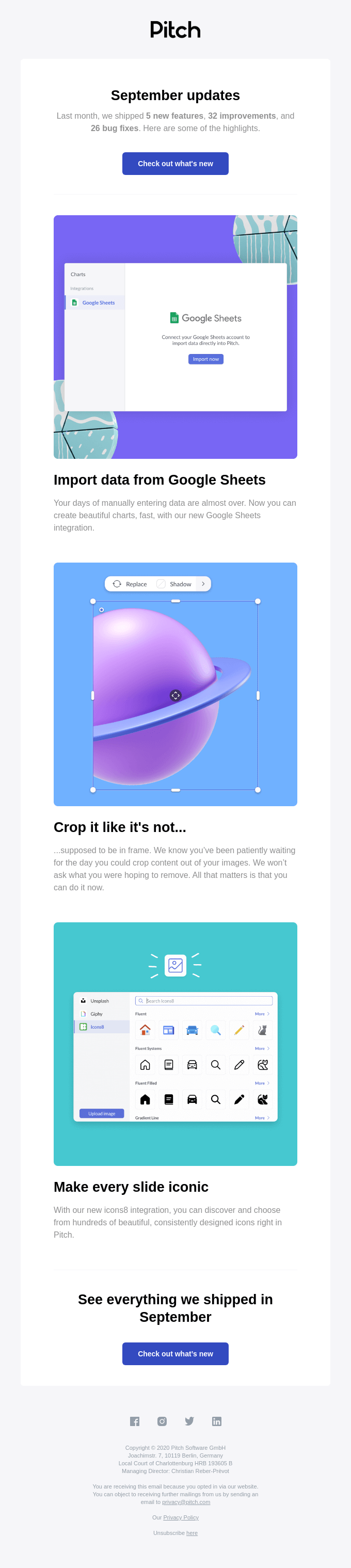 ✨New in Pitch: Integrations & image cropping 🙌 - Newsletter Text Content September updates Last month, we shipped 5 new features, 32 improvements, and 26 bug fixes. Here are some of the highlights. Import data from Google Sheets Your days of manually entering data are almost over. Now you can create beautiful...