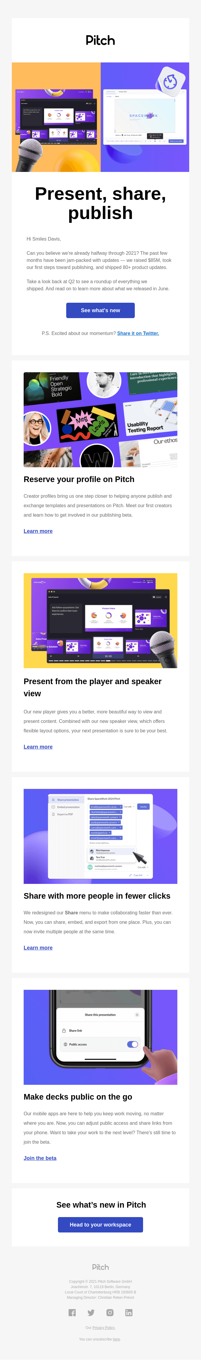New in Pitch ✨ Creator profiles, speaker view, and a look back at Q2 - Newsletter Text Content Present, share, publish Hi Smiles Davis, Can you believe we're already halfway through 2021? The past few months have been jam-packed with updates — we raised $85M, took our first steps toward publishing, and...