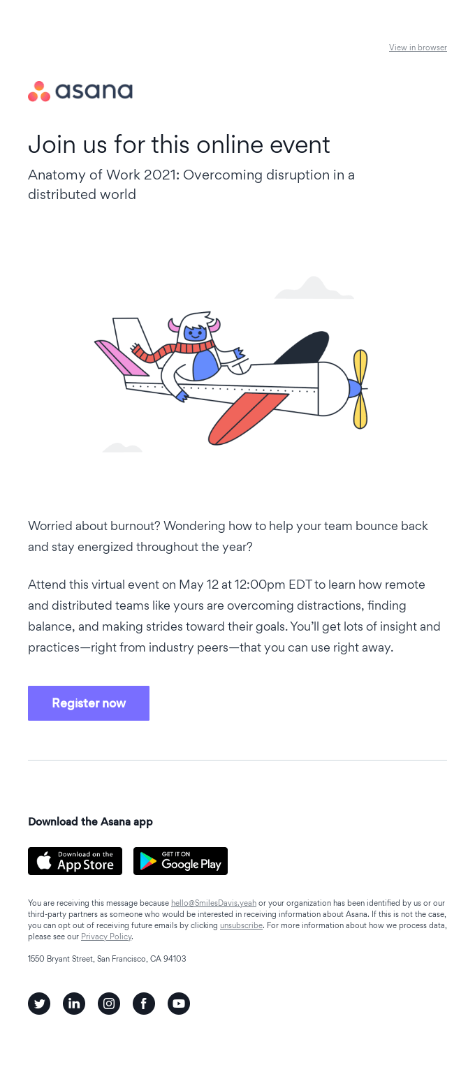You are receiving this message because [email protected]or your organization has been identified by us or our third-party partners as someone who would be interested in receiving information about Asana. If this is not the case, you can opt out of receiving future emails by clicking unsubscribe. For more information about how we process data, please see our Privacy Policy.