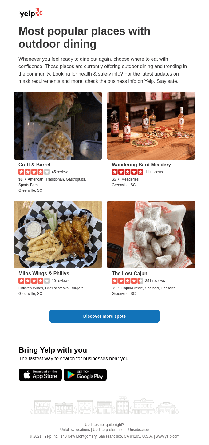 As if by magic, this email will attempt to read your mind... Here are some trending delivery and takeout spots that we also think you’ll love. Don't forget, you can always check business pages for their latest health & safety updates, like curbside pickup and mask requirements.