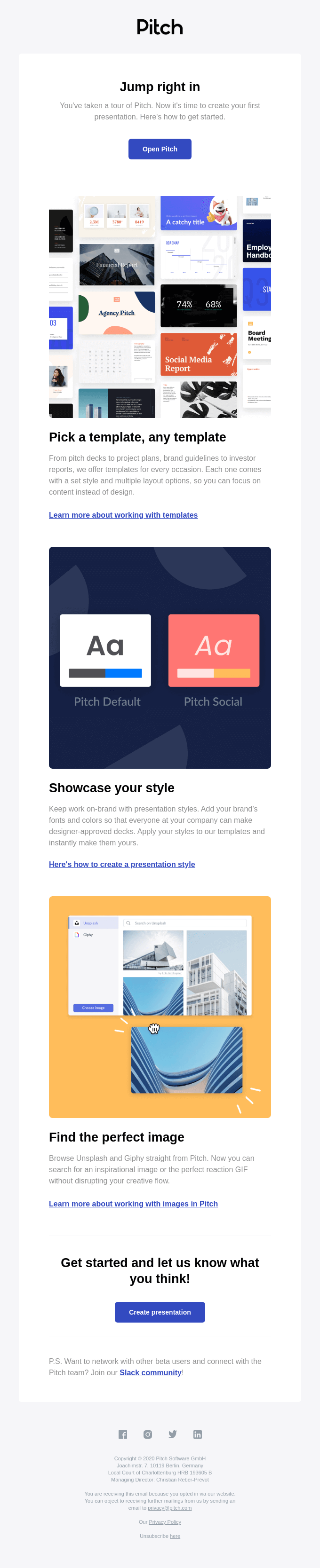 Pitch is a new product that helps teams build better-looking and more effective presentations in less time. During our beta, we're looking for people who are eager to try new software with their teams and give feedback on their experience. Is that you? Great, then let's get started!